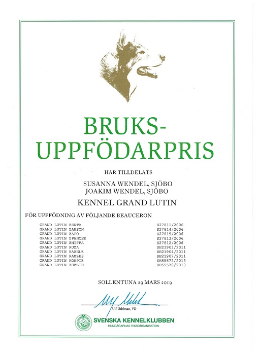SKK´s Bruksuppfödarpris, SBK´s Korningsdiplom (2 gånger för kennel + 3